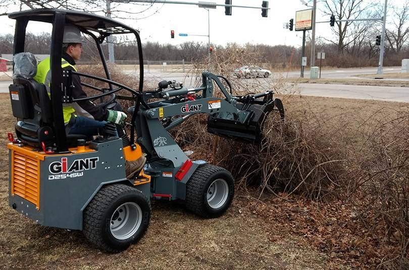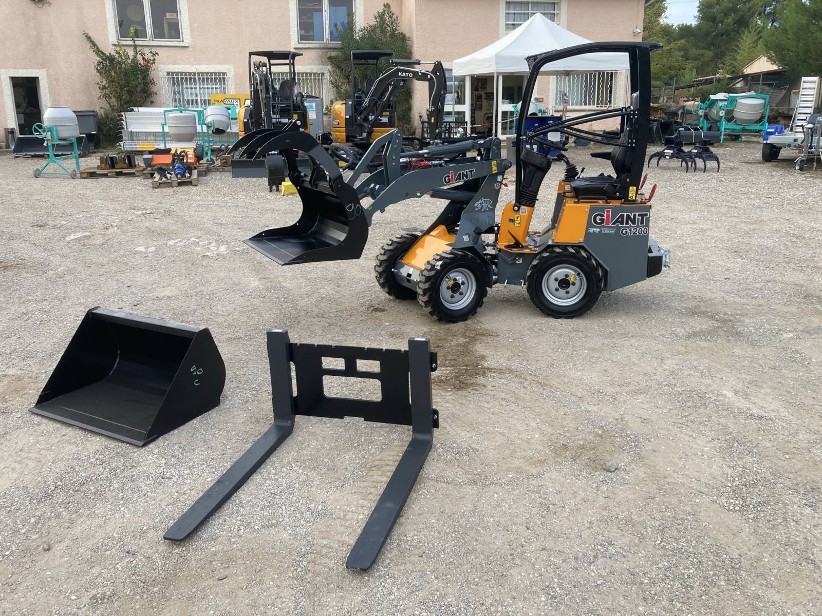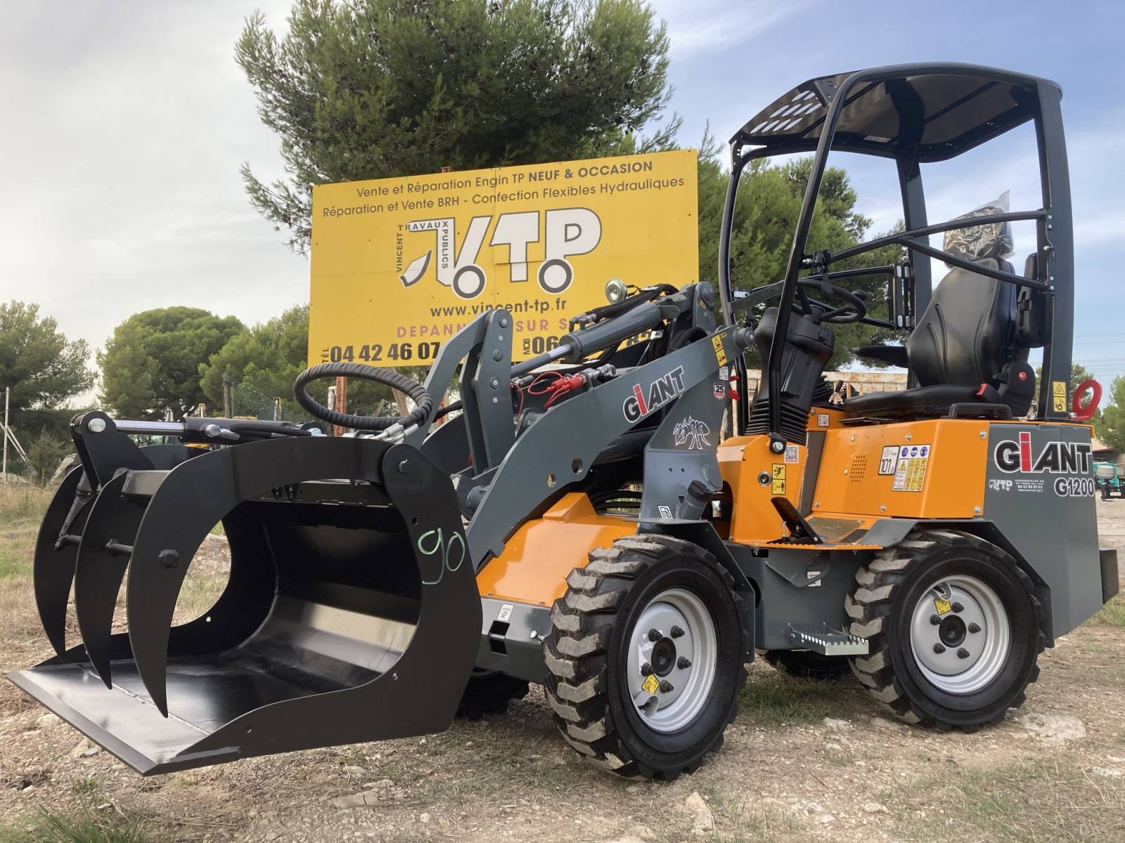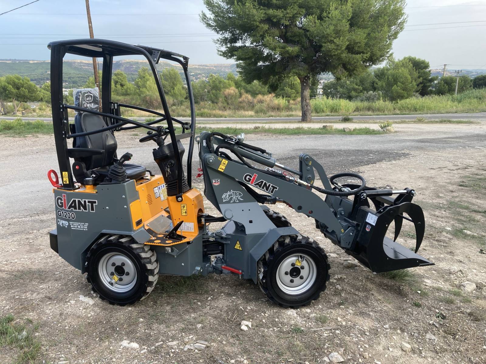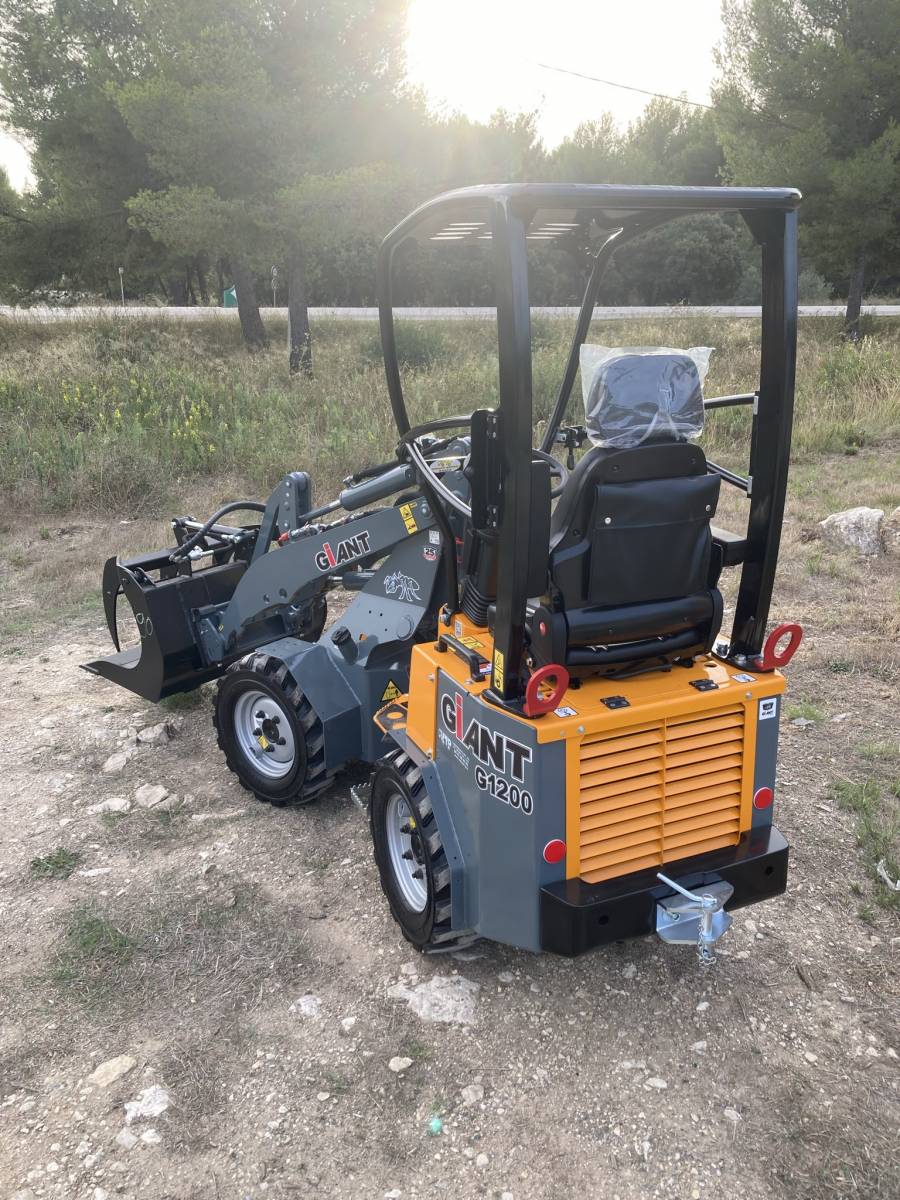VINCENT TP a Rognac dans le 13, vous propose sa mini chargeuse articulée GIANT G1200. Avec son kit fourches, son godet à grappin et son godet standard, elle répondra à tous vos besoins.