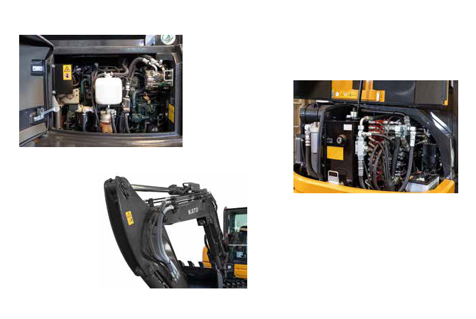 Tous les mouvements de la machine sont gérés par joysticks. L’installation est composée de trois pompes, 2 x 60 L/min + 1 x 44,2 L/min pour une pression de 24,5 MPa (250 kgf/cm2).